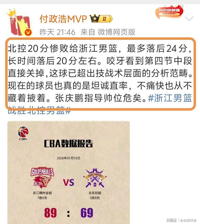 著名媒体人付政浩更是直言不讳,他在个人社交平台写道:北控20分惨败给浙江男篮,最多落后24分,长时间落后20分左右。咬牙看到第四节中段直接关掉,这球已超出技战术层面的分析范畴。现在的球员也真的是坦诚直率,不痛快也从不藏着掖着。张庆鹏指导帅位危矣。