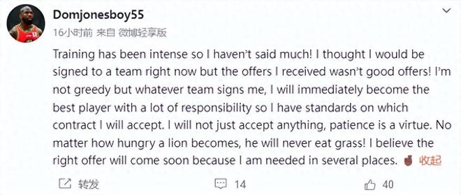 琼斯对此回应,在社媒发了一段话:“训练强度很大,所以我没怎么说!我本以为现在能签上一支球队,但收到的报价都不理想!我不是贪心的人,但无论哪支队伍签下我,我都会立刻成为最有责任感的顶尖球员,所以我对合同标准很挑剔。我绝不会随便接受任何条件,耐心是一种美德。狮子再饿,也绝不会吃草!我相信合适的报价很快就会到来,因为我有多方需求。”