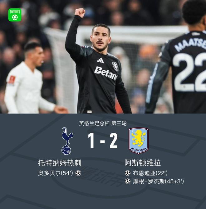 北京时间1月11日,英格兰足总杯第三轮展开较量,托特纳姆热刺迎战阿斯顿维拉。比赛中,阿斯顿维拉率先打破僵局,布恩迪亚接马伦助攻成功破门。随后在上半场补时阶段,布恩迪亚送出助攻,摩根-罗杰斯建功,进一步扩大领先优势。易边再战,托特纳姆热刺由穆阿尼助攻奥多贝尔扳回一球。此后双方均未能改写比分,最终阿斯顿维拉以2比1战胜托特纳姆热刺,晋级下一轮。