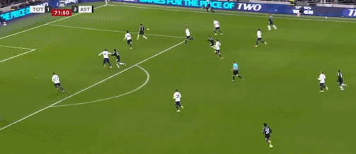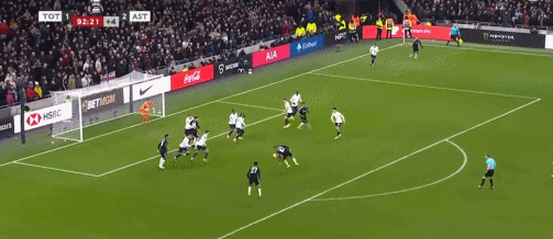第45+3分钟,布恩迪亚脚后跟做球,罗杰斯破门,维拉2-0热刺