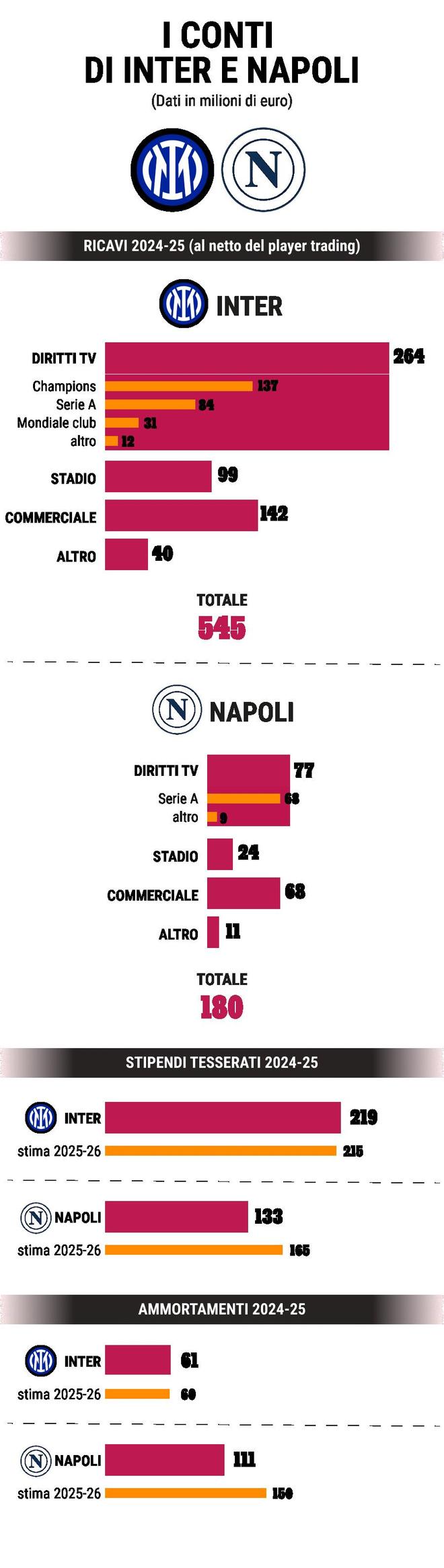 但在支出层面,情况则有所不同。球队阵容成本主要包括注册球员年薪,以及“球员注册权”的摊销费用,即球员购入成本的分期分摊。2024-25赛季,国际米兰球员年薪支出2.19亿欧元,那不勒斯为1.33亿欧元。摊销费用方面,国际米兰为6100万欧元,那不勒斯则高达1.11亿欧元。