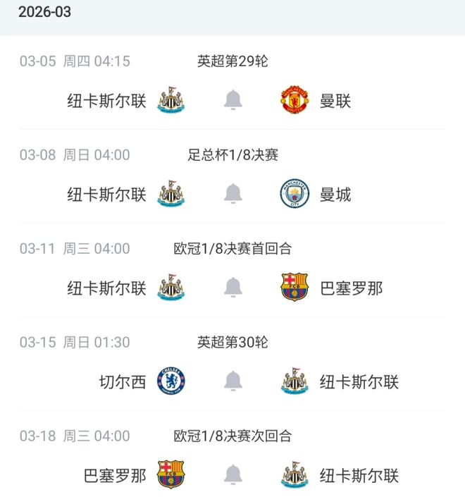 这也意味着,即将到来的3月份,纽卡斯尔将迎来超级魔鬼的赛程。从3月5日到18日这短短的14天时间内,他们需要连踢5场比赛,而且这5场比赛没有一场是轻松的。