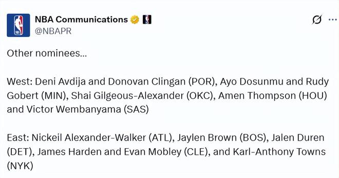 西部:阿夫迪亚和克林根(开拓者)、多森姆和戈贝尔(森林狼)、亚历山大(雷霆)、阿门-汤普森(火箭)、文班亚马(马刺)