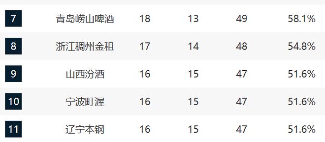 青岛和浙江排在第七和第八,他们现在的排名不上不下。而且这轮他们两个还直面对决,最终浙江赢了青岛,这算是卡位战了。