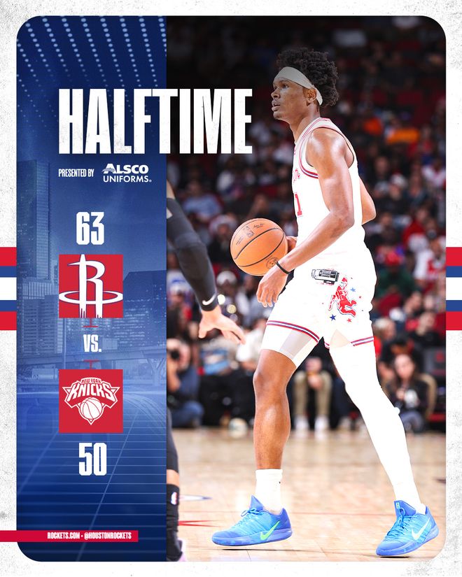火箭队的杜兰特上半场得到18分、5个篮板和4次助攻,伊森得到15分;尼克斯队的布伦森和哈特各得到7分。