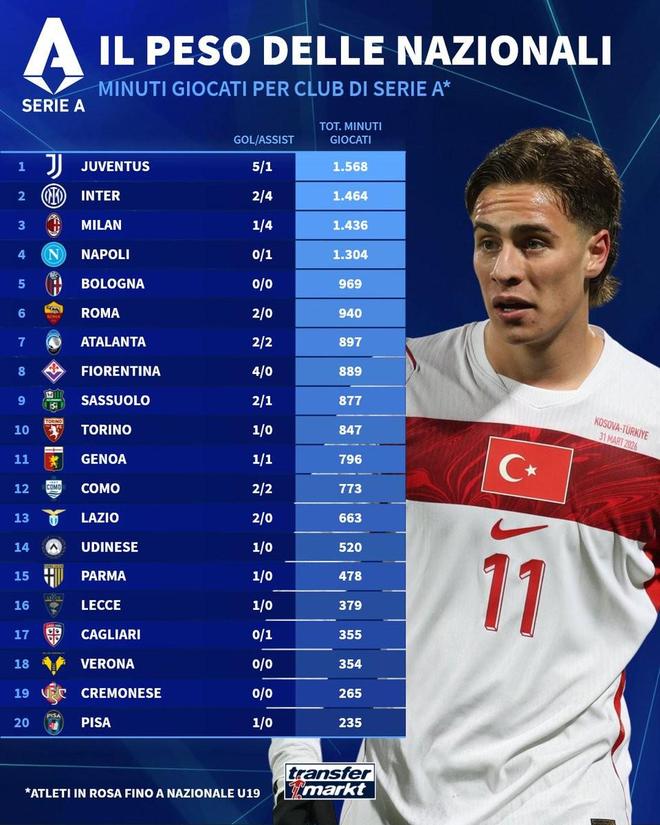北京时间4月2日,德转列出了意甲球队3月国际比赛日球员出场时间排行榜,尤文图斯球员合计出场1568分钟位列第一,国际米兰、AC米兰以及那不勒斯分列二到四位。