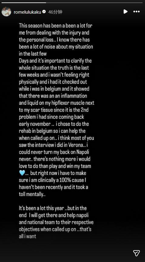 早些时候,卢卡库因为在受伤退出比利时大名单但没有按照约定返回那不勒斯遭遇批评,北京时间3月30日,他在社交媒体上发表动态,解释了自己的做法。